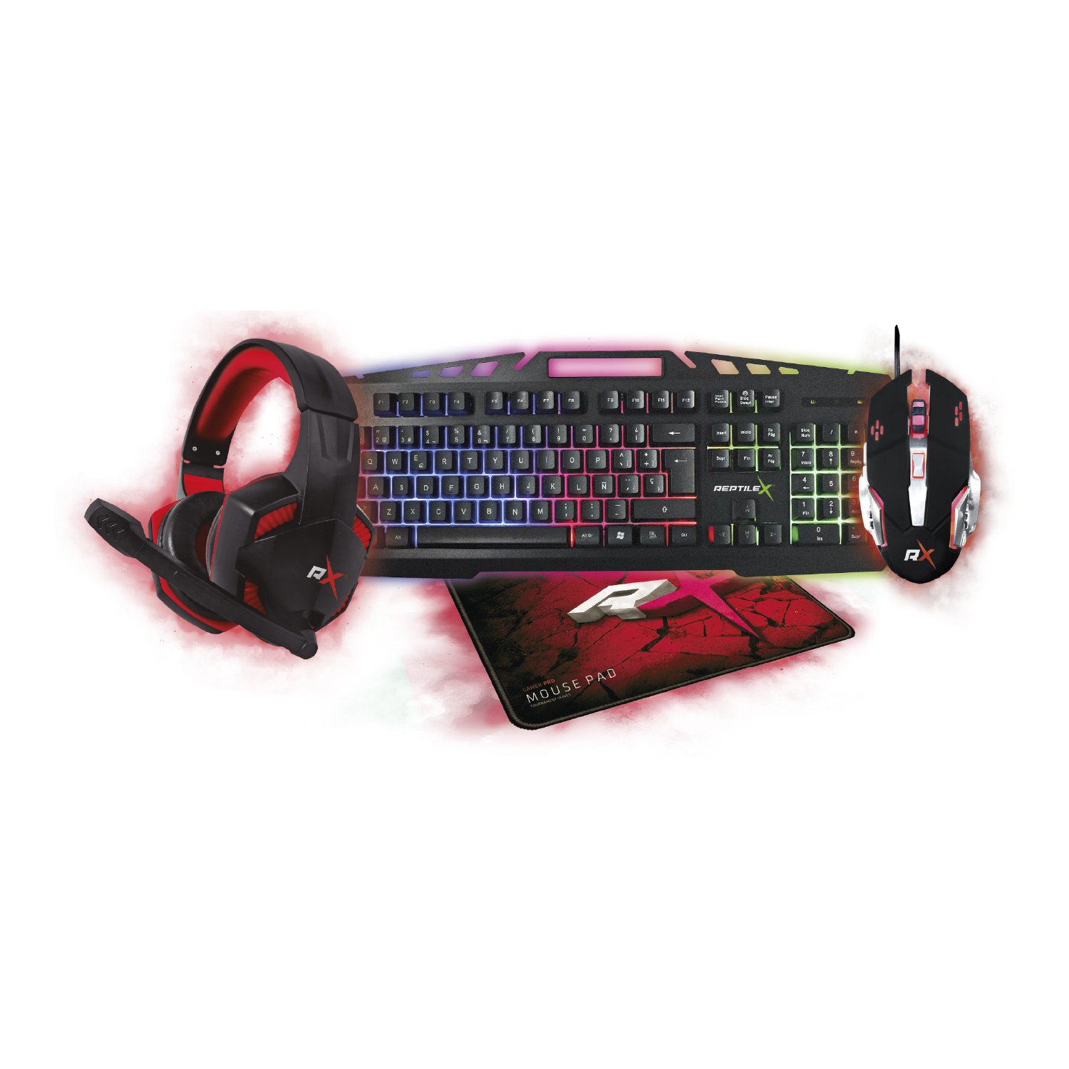 KIT 4 EN 1 AUDIFONO REPTILEX COMPATIBLE PC/PS4/X-ONE/SWITCH, MOUSE Y MOUSEPAD GAMER PRO, TECLADO GAMER CON LUZ LED ARCOIRIS.